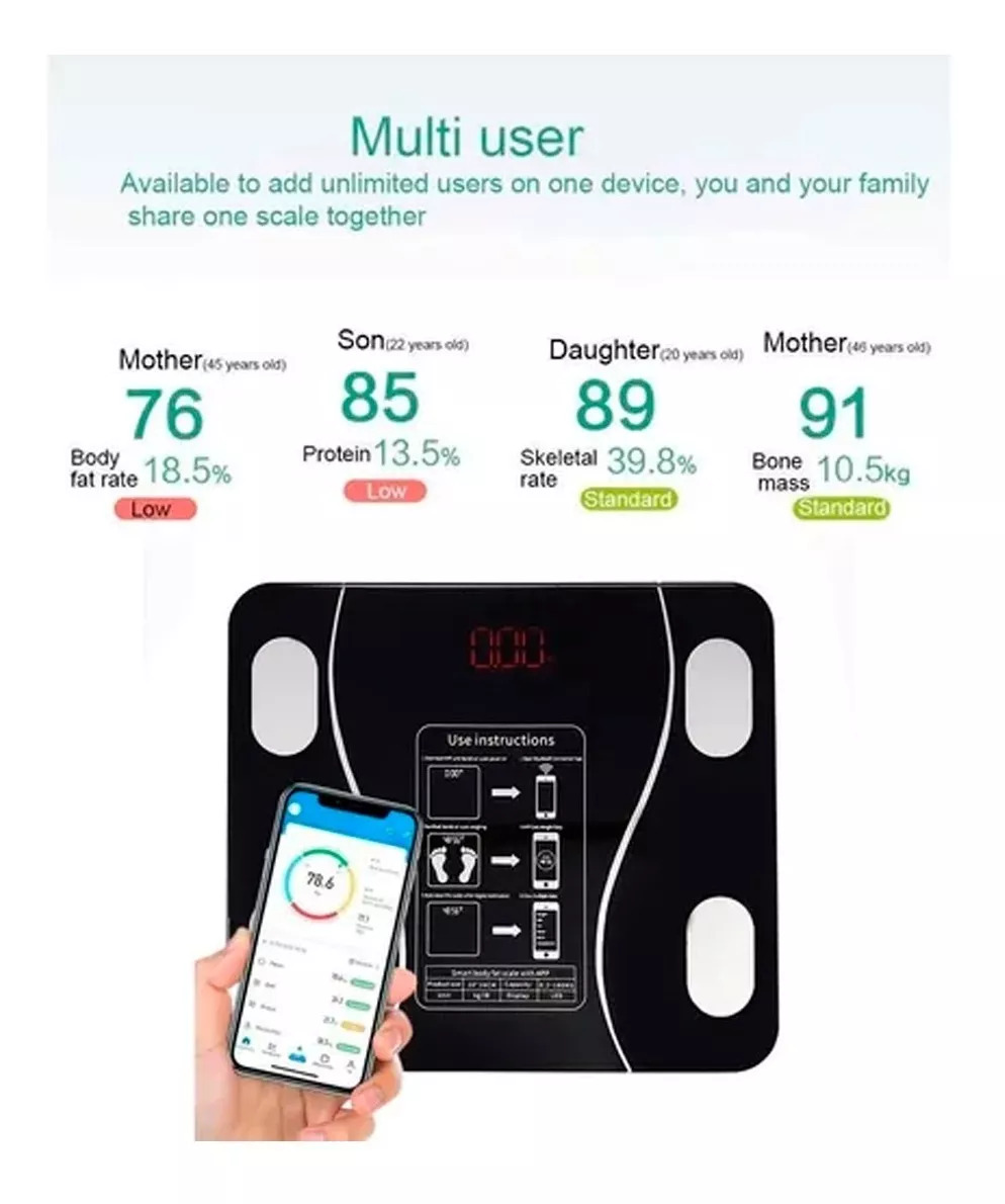 Balanza Digital inteligente Bluetooth, Ideal para controlar el peso corporal adecuado que mide hasta 180kg, Esta balanza tiene la particularidad que tambien posee un sistema de lectura mas precisa que los convencionales, ya que este registra tu peso corporal y te da una estadistica de cual es tu peso ideal, grasa corporal, agua, IMC, masa muscular, masa ósea, grasa visceral y proteína, hasta 15 detalles de datos.