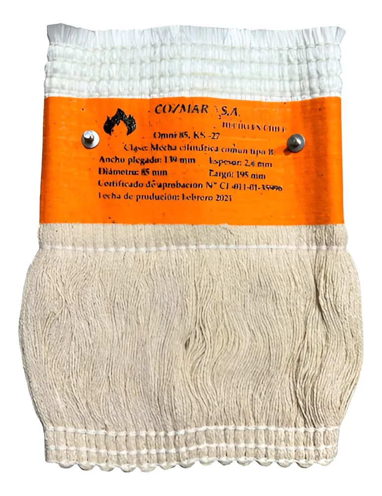 Mecha de alto desempeño, construida en su zona superior con fibra de vidrio y cuatro costuras de hilo de vidrio en la zona de combustión. En la zona inferior (Absorción) está compuesta de algodón 100% y un refuerzo de tela externo fusionada de 54 mm que fija el diámetro y proporciona una mejor adherencia al porta mecha o cremallera. Costura vertical de cierre con hilo de vidrio en zig-zag de tres pasos.